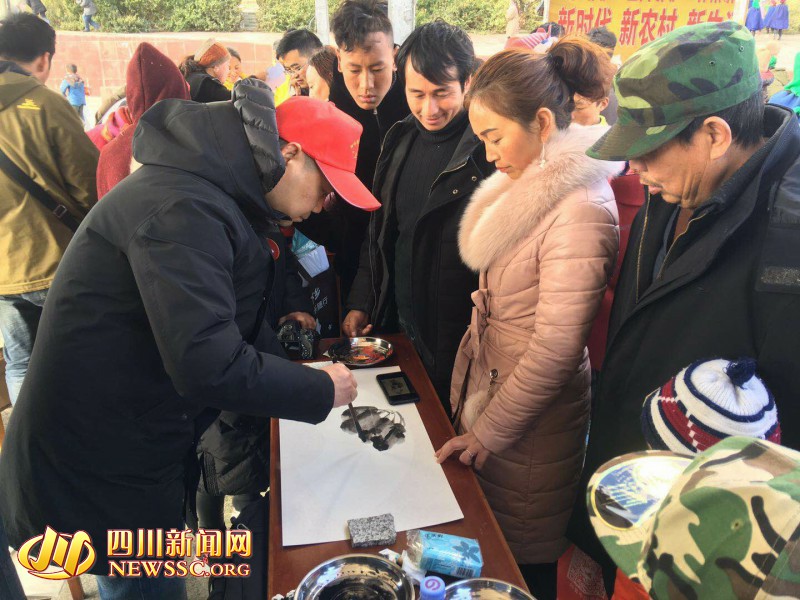 除了送收音机,现场还有书法家为群众们写春联、画家为群众画画。拿着一位书法家刚写好的春联,抱着孩子的李伍雷很是高兴,“现在的政策很好,我们老百姓得到很多的实惠。”