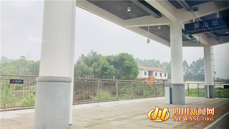 上午11:37分列车到达屏山站。屏山站位于宜宾市屏山县屏山镇凉坝村,建筑总面积达3481平米。屏山县是一座移民新城,境内山清水秀,林木苍翠,有著名风景区老君山和龙华古镇。屏山站在设计中采用四个大体量呼应山体的形象同时又有风帆的意向,寓意屏山人民刚毅的移民精神,建筑立面虚实渐变、疏密有致,竖向杆件形成了水流的动感,端庄大气之余不失精巧细节,使建筑现代精致,体现屏山“秀水”的动感意象。